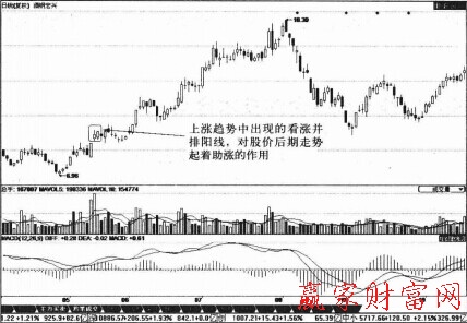 看漲并排陽線的出現(xiàn),表明股價仍會繼續(xù)上揚。其缺口往往會成為今后一段時期內(nèi)股價運行的一個支律區(qū)城。從圖中可以看到,在上漲趨勢中出現(xiàn)了看漲并排陽線之后,雖然在上漲途中股價經(jīng)過多次調(diào)整,但都受到缺口的支撐,所以之后的股價就繼續(xù)向上運行。在實戰(zhàn)中,當(dāng)股價下跌至該缺口區(qū)城時就應(yīng)該引起我們的特別注意,因為市場很有可能向相反的方向逆轉(zhuǎn)。根據(jù)這個道理,投資者見此K線圖形后應(yīng)以做多為主,但日后股價滑落缺口之下應(yīng)馬上反手做空,止損離場。
