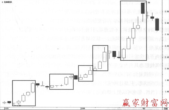 我們來看一下圖2,這是包鋼股份(600010)2005年12月9日~2006年2月17日的價格走勢圖。圖中標記框的地方都是這種具有方向性K線的地方,我們可以看到每一根K線對于前一根K線來講都是具有更高的高價的方向性K線組合,我們可以利用某種進場方法持有,只要不出現(xiàn)對空方有利的K線形態(tài),我們就可以一路持有,以獲得更大的利潤。一旦交易者遇到這類走勢,不要輕易離場,不能因為某些與交易無關(guān)的因素影響我們獲利。請大家注意:這里并沒有涉及收盤價與開盤價的相對位置,也就是說,這里并沒有根據(jù)陰線陽線來看方向性。大家可以關(guān)注一下兩陰夾一陽的K線形態(tài)。