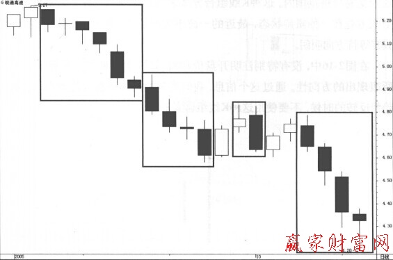 接下來我們再看一張具有下跌方向性的K線組合圖,圖3是皖通高速(600012)2005年9月12日~10月18日的價格走勢圖。圖中標記框的地方都是這種具有方向性K線的地方,我們可以看到每一根K線對于前一根K線來講都是具有更低的低價的方向性K線組合,這種情況對于做股票的交易者來講,不能進場,只要不出現(xiàn)對多方有利的K線形態(tài),我們就可以一直等待,以回避風險。一旦交易者遇到這類走勢,不要輕易進場,不能因為某些與交易無關(guān)的因素影響我們獲利。請大家注意:這里并沒有涉及收盤價與開盤價的相對位置,也就是說,這里并沒有根據(jù)陰線陽線來看方向性。這種K線形態(tài)其實與趨勢的定義是完全一樣的,當有更低的高點與更低的低點出現(xiàn)時就是向下的趨勢狀態(tài),當有更高的高點與更高的低點出現(xiàn)時就是向上的趨勢狀態(tài)。只是這種情況看起來更流楊一些,并且其中沒有逆向的走勢狀態(tài)(當然,您也可以把上影線與下影線看做是對趨勢的回調(diào)或者反彈)。