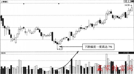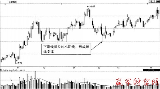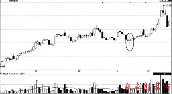 如圖1所示,天藥股份的日K線中,該股在10.47元見頂回落,直到一根下影線很長的小陰線確認了該股短期底部,反彈才開始展開。從成交量上來看,出現這根下影線很長的小陰線之后,成交量卻有所放大,帶動該股從調整的行情當中解脫出來。
