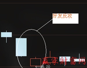 4.好友反攻與曙光初現的形態有些類似,只是它的后一根陽線的實體并沒有深入到前一根陰線的實體當中,只是形成了“遭遇”,因而信號會弱一些。