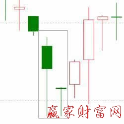 形態介紹:上漲形態。在下跌趨勢中,出現一根帶長下影線的陰線,緊接著出現一根小K線,第二根K線的實體及陰線,完全處于前跟K線的長下影線之內,此時意味著下跌行情可能發生反轉,被稱為下跌盡頭線。