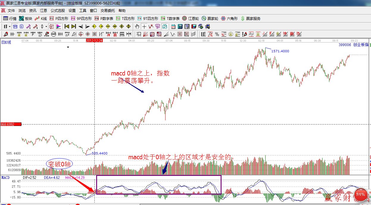 請大家認(rèn)真看一下創(chuàng)業(yè)板走勢的日線圖2012年12月24日開始,macd的黃白線站上了0軸,隨后一路震蕩攀升,一直到1400--1500多,相信2013年里,人人都看到了創(chuàng)業(yè)板的牛市拉升,所以參與0軸之上的個(gè)股或指數(shù),回避0軸下方的市場或股票,這就是最簡單的防狼術(shù),