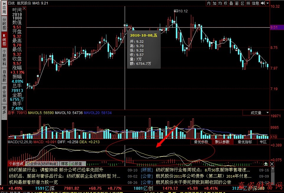 如 600987航民股份,該股在2010年10月8日股價見高9.7元后,2010年月11日股價再創新高10.12元,股價雖創新高,但2010年10月15日D與DEA的死叉點為0.25,而2010年11月12日DIFF與DEA的死叉點為0.16~明顯的前一個死叉點高于后一個死叉點,這就是頂背離,說明這種創新高的可信度不高,后面可能展開調整,如圖。