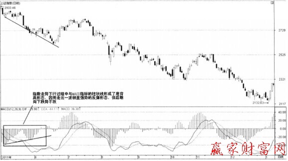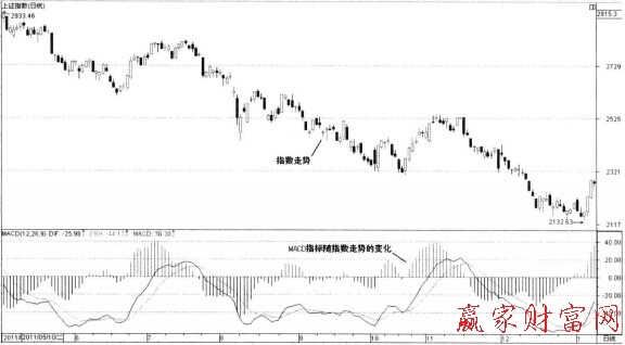 在指數(shù)走勢中,日K線周期中的MACD指標(biāo)表現(xiàn)得十分靈敏,對于趨勢的變化有很迅捷的提示,但在準(zhǔn)確性上會使得部分常用的指標(biāo)性形態(tài)大失本色。在日線周雙中,MACD指標(biāo)的金叉和死叉相對而言反應(yīng)遲鈍,柱狀線的萎縮放大特征出現(xiàn)得更快,但在準(zhǔn)確性上頻繁出現(xiàn)誤區(qū),而最穩(wěn)健的指標(biāo)信號就是背離,雖然也有騙線,但不可否認(rèn)其意義。如圖下圖所示,是指數(shù)走勢與MACD指標(biāo)的形態(tài)示意圖。