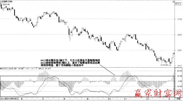 如下圖所示,是上證指數(shù)日K線中形成的MACD線長期處于0軸之下的弱勢形態(tài),從圖中標(biāo)志區(qū)可以看出,股價在漫長的跌勢中市場氛圍極其低迷,MACD線長期處在0軸之下,偶爾在反彈行情的帶動下才會勉強上0軸。正所謂事不過三,此時的最后一波漲勢是否只是短暫的漲勢?從技術(shù)領(lǐng)域來看,它更偏向于是底部反轉(zhuǎn)形態(tài)的確立,對于投資者而言,此時正是一波大上升浪的開啟時刻。