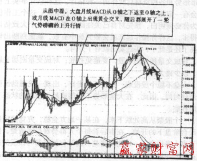 抄底如何才能做到謹慎呢?我們觀察了滬深股市MACD月線走勢圖后,發(fā)覺有一個情況值得我們高度關注,它對我們認識和把握大盤的底部有一定的幫助。即當月線MACD在0軸上方出現(xiàn)黃金交叉,或月線MACD下穿0軸重返0軸之上,常常預示著大盤探底告一段落,之后就會有一輪新的上升行情出現(xiàn),如下圖所示。