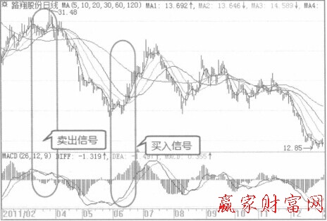 路翔股份(002192)在股價的高位和低位,分別出現DIF線下穿DEA線、DEA線上穿DIF線,即分別出現賣點和買點,投資者可根據此信號進行操作。如下圖所示。