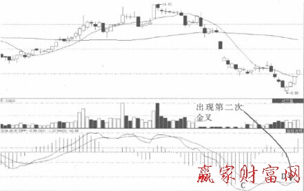 如下圖所示,ST澄海的下跌趨勢是相當明確的。但就是在這樣明確的下跌趨勢當中,MACD曲線卻沒有延續下跌的趨勢。圖中D位置對應的曲線顯然是比C位置升高了許多,而該股的股價卻創出8.08元的新低,說明MACD指標已和股價出現了非常顯著的背離走勢。而背離之后的圖中D位置出現的金叉已向投資者顯示出買入股票的信號,這時候建倉之后獲利將比較有把握。原因就是金叉出現在底部背離之后,并且該股是以四連陽的形式連續上漲形成MACD金叉的,買入信號的說服力更強一些。
