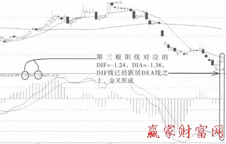 而從MACD指標上來看,就是這一根陽線形成之后,DIF數值已經增加到-1.24.,DEA數道已經相對減小到-1.36。顯然,DIF躍居DEA曲線之上,金叉買入形態出現,投資者可以買入股票了。