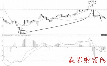 在熊市比較長的下跌趨勢中,股價日復一日地下跌,沒有任何反轉的跡象,出現股票被套的情況。但從MACD曲線的變化趨勢上來看,確已出現了非常顯著的觸底反彈行情。MACD與股價出現背離的時間越長,出現金叉之后建倉的效果就更好。如果投資者判斷下跌的趨勢持續的時間不會太長,半年之內市場就會重回升勢的話,基本上一兩次的背離之后出現的MACD金叉就可以作為投資者建倉的依據。
