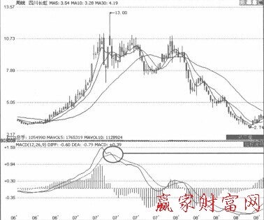 2.四川長虹(600839)的周K線圖和周線MACD,其股價通過大幅拉升后,只出現一次高位死亡交叉,而這一次死亡交叉出現就宣告行情結束,如圖所示。所以在這種情況下,買進股票,持股待漲,直到周線MACD出現死亡交叉賣出股票。周K線出現了射擊之星是明顯示的見頂信號。