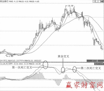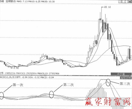 6.如果要進場,在周線MACD中出現黃金交叉時少量參與,第二次出現死亡交叉,賣出所有股票。因為這時周線MACD出現頂背離,即股價上升,而MACD出現下降,并且均線開始發散;K線出現穿頭破腳。