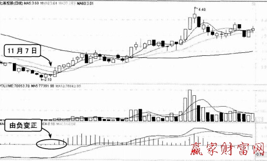 如圖所示,七喜控股(002027)在2008年11月7日之前,MACD參數由負轉為正,意味短期走勢將變強,后市可能進入反彈行情。果然,從11月7日開始,七喜控股股價開始反彈,成交量也逐步放大,最終從2元上漲到4.4元,漲幅超100%。