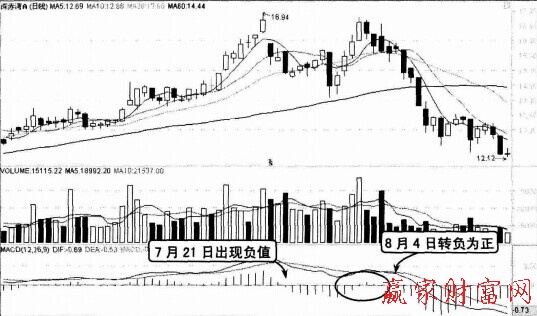 如圖所示,深赤灣A (000022)在2009年5月到7月走出一路上漲行情,MACD指標大部分時間都是正值,直到7月21日股價出現較大幅度下跌,MACD才重新回到負值。8月4日,MACD從負值轉成正值,此時按照MACD由負轉正的規律,股民進場購買股票。