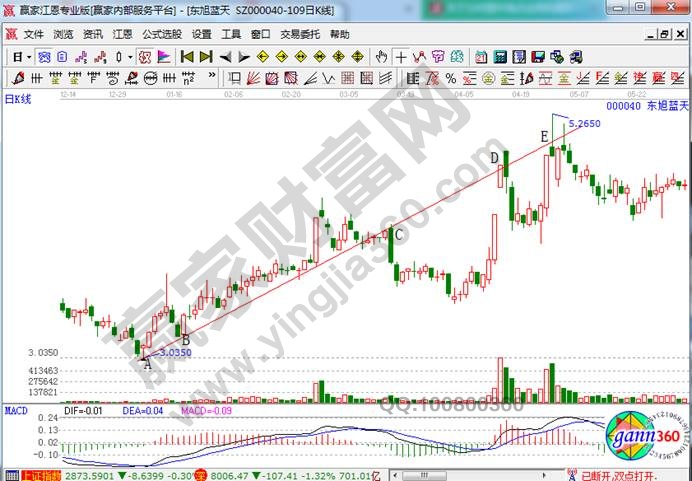 上面是東旭藍(lán)天在12年年初到12年5月份的走勢(shì)圖,從圖中我們可以看到:股價(jià)從A點(diǎn)反轉(zhuǎn)向上,可以畫(huà)出一條上升趨勢(shì)線。在上升趨勢(shì)線沒(méi)被破壞之前,可以持續(xù)做多,此后該股在C處長(zhǎng)陰線跌破上升趨勢(shì)線,原有的上升趨勢(shì)線已經(jīng)是被破壞了,所以需要重新確定。