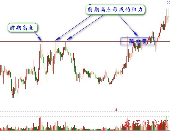 2、前期高點阻力。與前期低點相似,前期高點不一定是波段最高點,但是該位置會對當前的股價形成一定的阻力作用。其原因有兩個:①前期高點附近進入的套牢盤,因為接近成本,面臨著很大的拋壓;②底部獲利籌碼尋求變現,會隨著接近前期高點逐漸變大。