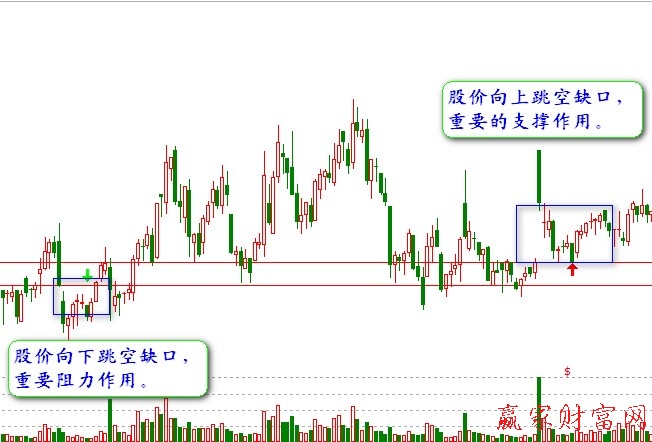 六、缺口形成的阻力或支撐作用。缺口位置沒有成交,是成本和套牢盤的隔離帶,其支撐或阻力作用是非常明顯的,如果股價回踩向上跳空的缺口,則缺口位置是重要的支撐位;如果股價上攻向下跳空的缺口,則該位置是重要的阻力位。