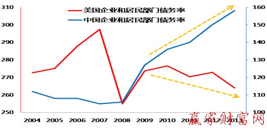 其次,債務不僅沒有去化,反而再度大幅擴張,導致債務黑洞不斷吞噬信貸資源、居民收入和企業活力。美國在金融危機之后堅定去杠桿,截至2013年,居民和企業部門的債務/GDP比率從2007 年的300%左右降至260%左右。但中國卻在政策的刺激之下逆勢加杠桿,居民和企業部門的債務/GDP比率從2007年的105%大幅攀升至2013年的158%,其中主要是政府穩增長主導的國有企業加杠桿。居民和企業的債務負擔不斷加重,直接吞噬了居民的可支配收入和企業的自由現金流,擠占了大量信貸資源,導致無風險利率高企,消費和投資意愿不足,經濟無法內生復蘇。這也是2011年之后產能利用率和經濟增速再度回落的主因。