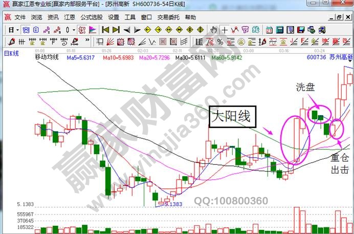 在大陽線第三天若個股仍下跌這時機會就在眼前了,應密切關注個股下跌的承接盤和下跌幅度,一般洗盤不會超過三天,有的兩天。再洗盤后發現個股小陽線盤升這時就可重倉買入,如下面的蘇州高新走勢圖。