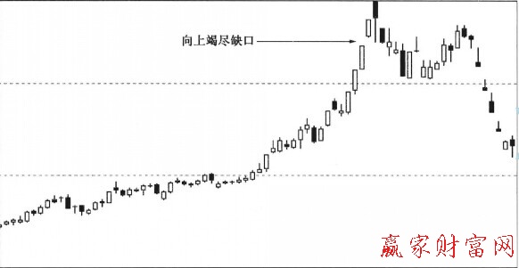 4.向上跳空缺口被回補后,雖然股價會再度上升,但沒能超過近期的高點,卻又重新掉頭朝下,向上竭盡缺口的形態基本確立,投資者應及時逢高賣出。