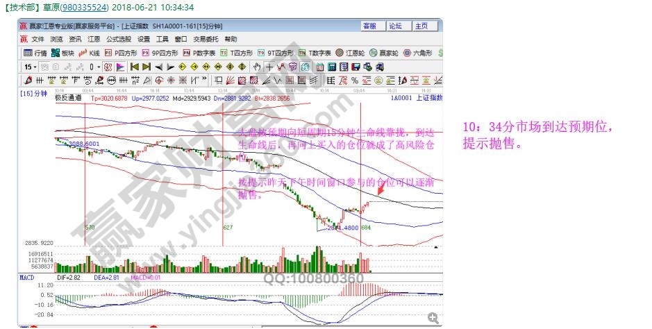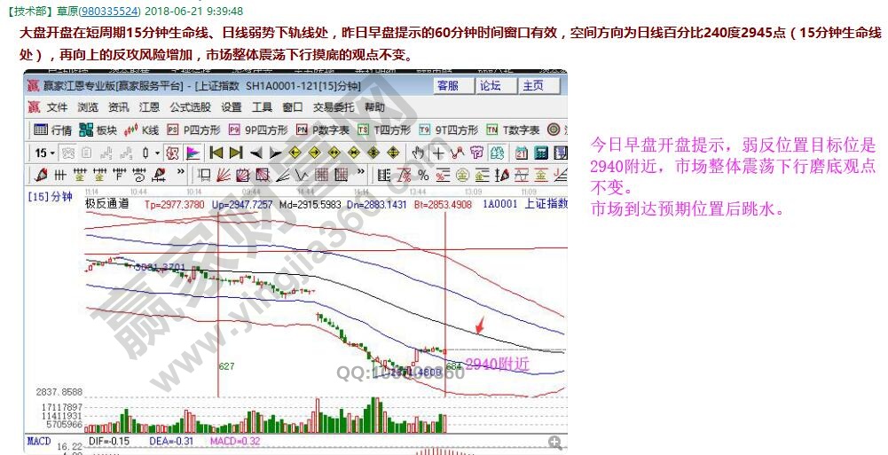 20號早盤提示短周期15、30、60分鐘均在趨勢工具極反通道紅色極弱外軌線處,下午第一個小時是時間窗,大盤會有一個弱反,當天午盤到達了弱反的第一個目標位2925點,公眾號文章談到,今天順勢上攻2945附近則完成本次弱反,并且早上到達位置提示拋售,一次公開的操作結束,等待贏家江恩系統工具再次發出趨勢、時間、價格共振性參考位,會繼續給大家展示工具的實戰效果。