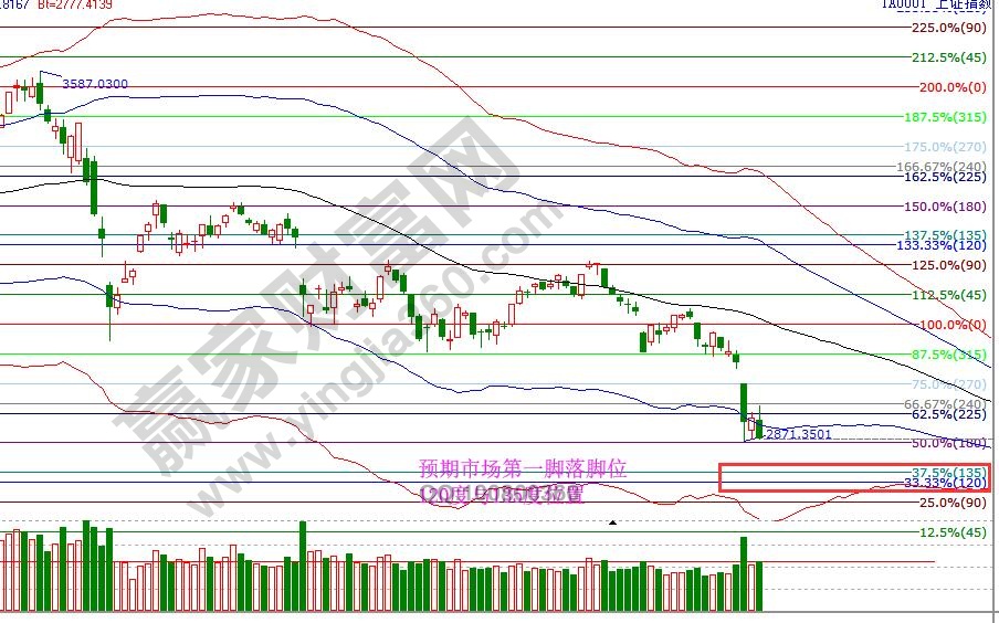 大盤日K線百分比180度2868點短暫的歇腳位及提示弱反的空間已實現,22號對此線進行考驗,失守則向下是120度和135度2791--2809位置,這里存在形成像樣反彈的概率較大,趨勢工具極反通道也支持再次快速下跌的周期共振,等待贏家江恩工具信號。