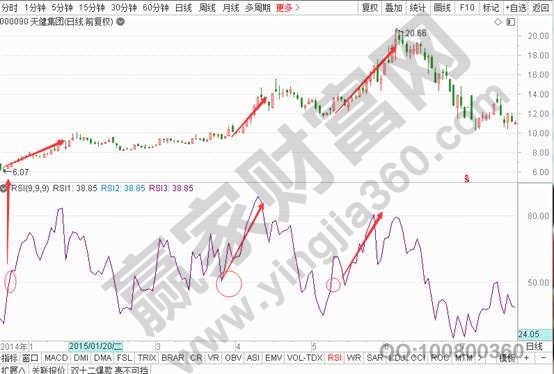 1、 股票呈現多頭趨勢的話,RSI突破50值就是買點。如果是賺了的話,就可以逢高離場,如果賺了錢沒有離場的話,一旦RSI跌破50值那么就是賣出點位。如下面的天健集團走勢圖。