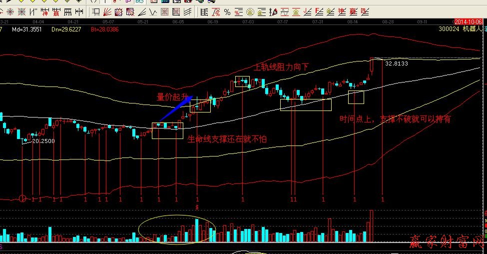 為什么要做這只股呢?因?yàn)闀r(shí)間點(diǎn)在8月14日已經(jīng)出來(lái)了,并且是在極反通道生命線上,說(shuō)明該股支撐很強(qiáng),且時(shí)間點(diǎn)到了,而且大盤(pán)行情也不錯(cuò),機(jī)會(huì)很多,所以該股是可以操作的,因?yàn)橛匈I(mǎi)入的理由。從圖中可以看出,買(mǎi)入后,股價(jià)一直都都穩(wěn)步上漲,并在8月21日漲停,并突破黃色上軌線,又形成新的買(mǎi)點(diǎn)。如果投資者操作了該股,那么接下來(lái)就提高止盈位保護(hù)收益即可(站穩(wěn)一線,看高一線,一線未站穩(wěn),回落一線),想知道目標(biāo)在哪的可以聯(lián)系贏家江恩客服。