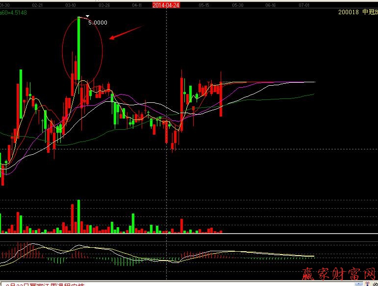 2014年3月,200018中冠B經過連續大幅拉升后,以一個經典的看跌吞沒形態結束行情,后市進入了長達數月的調整,直至今日股價仍然沒有越過當時的高點5.000元。