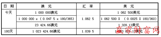 通過預算利率對每種貨幣的遠期影響,我們能得出即期交易中每種貨幣的未來價值。因此,我們看到,180天后,假定利率是4.75 %,1000 000澳元將價值1 023 424.66澳元;假定利率是0.25%,1 062 500美元將價值1 063 828.13美元。