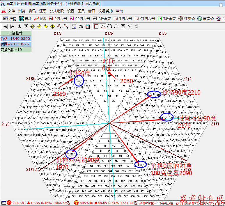 第一步,確定起點(diǎn),我們以13年6月25日,1849.65點(diǎn)作為起始點(diǎn),1849縮小10倍,“185”在六角形中找到相對(duì)應(yīng)的位置,這樣時(shí)間,價(jià)格的0度全部有了,
