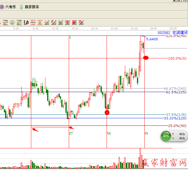 ,以近期的高點(2013年12月4日)作為起點,然后找近期的低點(2014年1月13日)做為終點,連個點連接一下,后面重要的時間點就出來了,2014年2月26日就是重要的時間變盤點,在豎線上,時間點結合價格來做買賣,價格工具用的是贏家江恩工具中的波段百分比延伸線,2014年2月26日變盤點,同時在37.5%的重要支撐位,所以這個點位就是個買點,那未來怎么看,下一個變盤點是2014年4月4日,明天關注125%(90)的壓力,一旦突破就繼續飆升,如果明天回踩破了100%(0)的支撐位的話,那就會繼續下跌回踩了!根據工具做好股票的操作計劃!