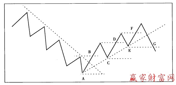 從圖中的下降趨勢突破下降趨勢線并突破前期高點時(B點),交易者認為符合123法則,決定執行突破買人策略,將止損定在前期低點(A點)稍下處。如果價格開始網調跌破A點,那就說明下降趨勢并沒有真正反轉,只有價格回調至C點后開始繼續上升,直至價格突破前期高點后才能上調止損(突破點為D點,止扭從A點上移至C點稍下方)。按照這種思路,交易者必須耐心等待價格的再次有效突破才能確定上升趨勢的延續.如果價格回調后過度,跌破前期的低點(比如圖中的價格在G點跌破前期的低點E點),那就意味著該趨勢可能會發生變化,或者市場面臨更大的回調后繼續上升。不管怎樣,觸發止報后就表明本次交易告一段落,交易者還要耐心等待下一次進場信號的出現。