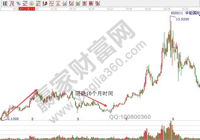 連續陰跌既然是洗盤,那么本質都是利用較為少量的籌碼達到洗籌的目的,整體趨勢來說是在底部有明顯的進倉過程,在頂部沒有高位放量,后市還是拉高的走勢。這類個股上一般來說盤子都比較大,長久的不活躍也會被認為是正常,受到炒作的機會較少。并且這種個股在第一波漲勢中的漲幅并不大,在連續陰跌之后前面的上漲趨勢已經不再受到關注,股價繼續下跌,投資賣出的意愿不強,而沒有出現上漲苗頭,賣盤也不多,持續的縮量陰跌的格局就會持續。比如下圖股票的走勢圖就是如此。